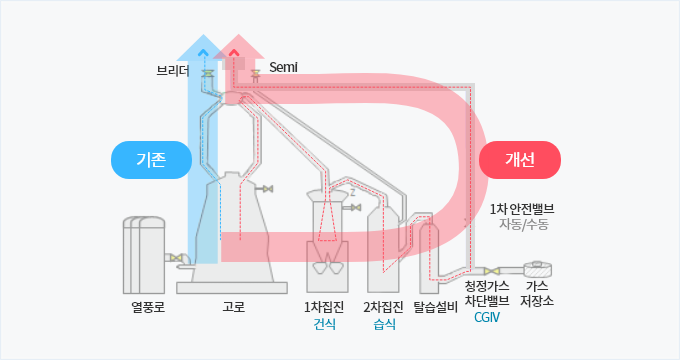 재송풍2) 공정 시 고로 브리더를 통해 대기오염물질이 배출된다는 지적에 따라 유럽의 전문 엔지니어링 기술회사와 긴밀하게 협업해 대기오염물질을 획기적으로 저감하는 가스청정밸브 개발에 성공했습니다. 이후 본 설비를 '1차 안전밸브'로 명명하고 유럽 특허 출원을 마쳤으며, 2020년 상반기에 모든 고로에 설치했습니다.