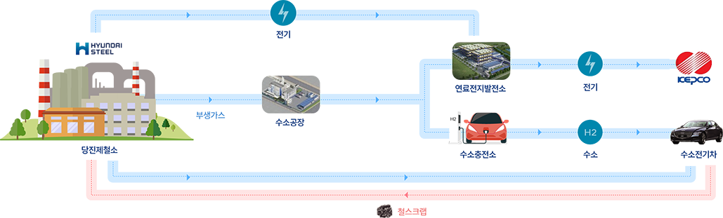 (MOU)'를 체결하고, 고순도 수소 공급 및 인프라 확대를 위한 사업계획을 발표했습니다. 앞으로 현대제철은 수소 생산‧유통시설을 확대 구축하고 주요 사업장에 FCEV 도입 및 수송차량을 확대 적용함은 물론, 수소를 활용한 친환경 연료전지발전 시스템을 구축할 계획입니다. 아울러 친환경 발전원 적용과 전력 자급률 제고를 위해 자체 수소 생산시설과 연계된 연료전지발전 시스템의 구축 및 운영에도 이바지할 것입니다. 자원 순환 및 재활용을 적극 추진하고 있는 현대제철은 향후 수소 생산 및 친환경 에너지 부문에도 적극 참여하며 세계 최고의 친환경 제철소로 나아가겠습니다.