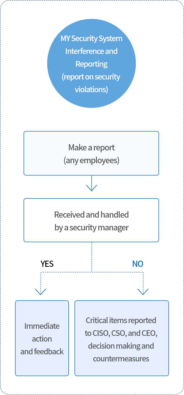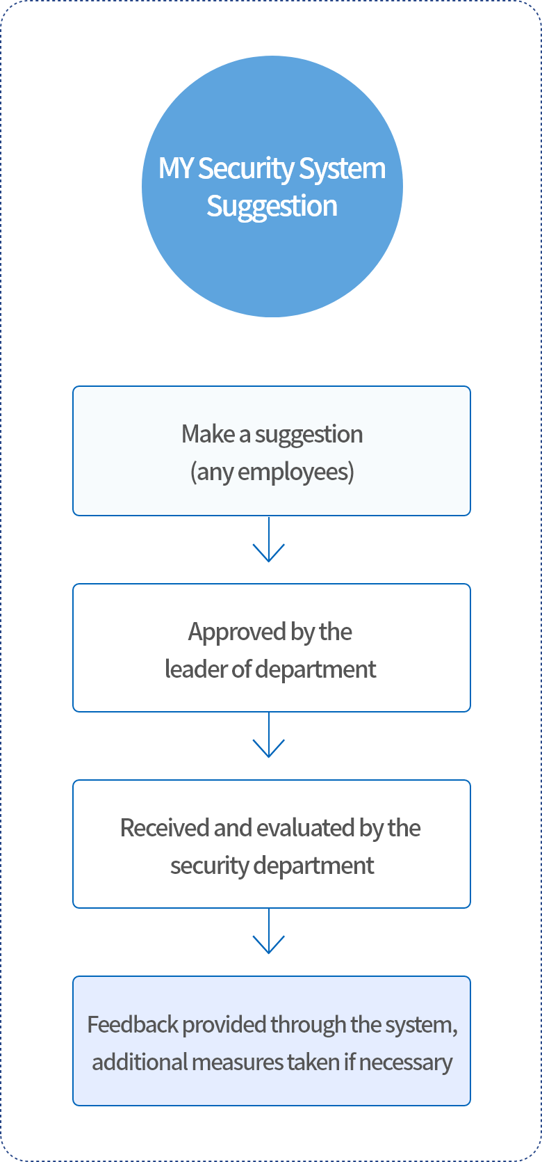 Hyundai Steel operates a system where our employees can make suggestions, report threats or problems relating to information protection, and express opinions. Items of high priority are reported to the top management, and actions are taken for improvement. Besides, various security channels can be used for sharing security threats, just as the aforementioned suggestion and reporting system. Through these multiple channels of communication, we promptly deal with security violations, threats, etc., take actions and provide feedback.